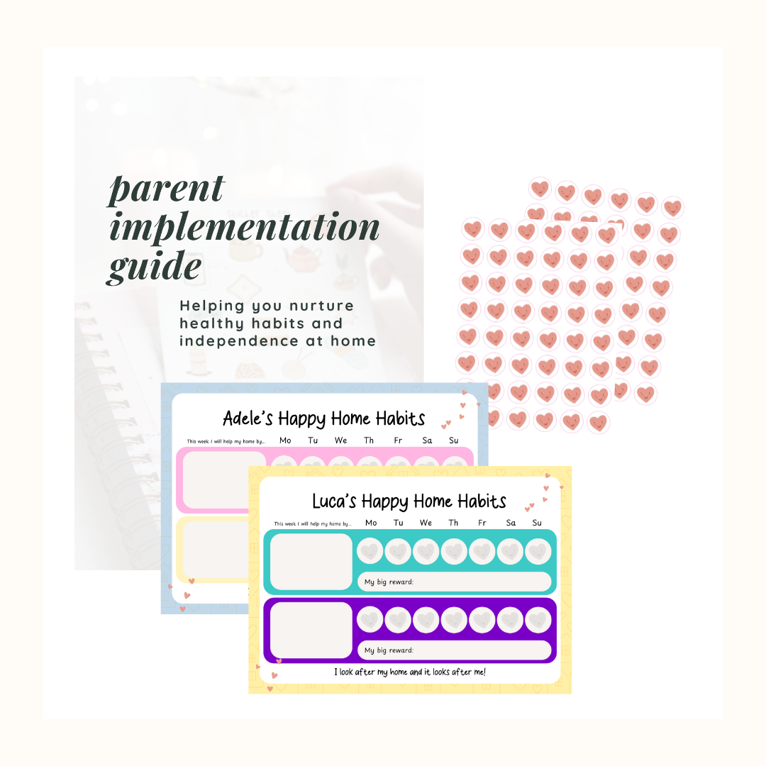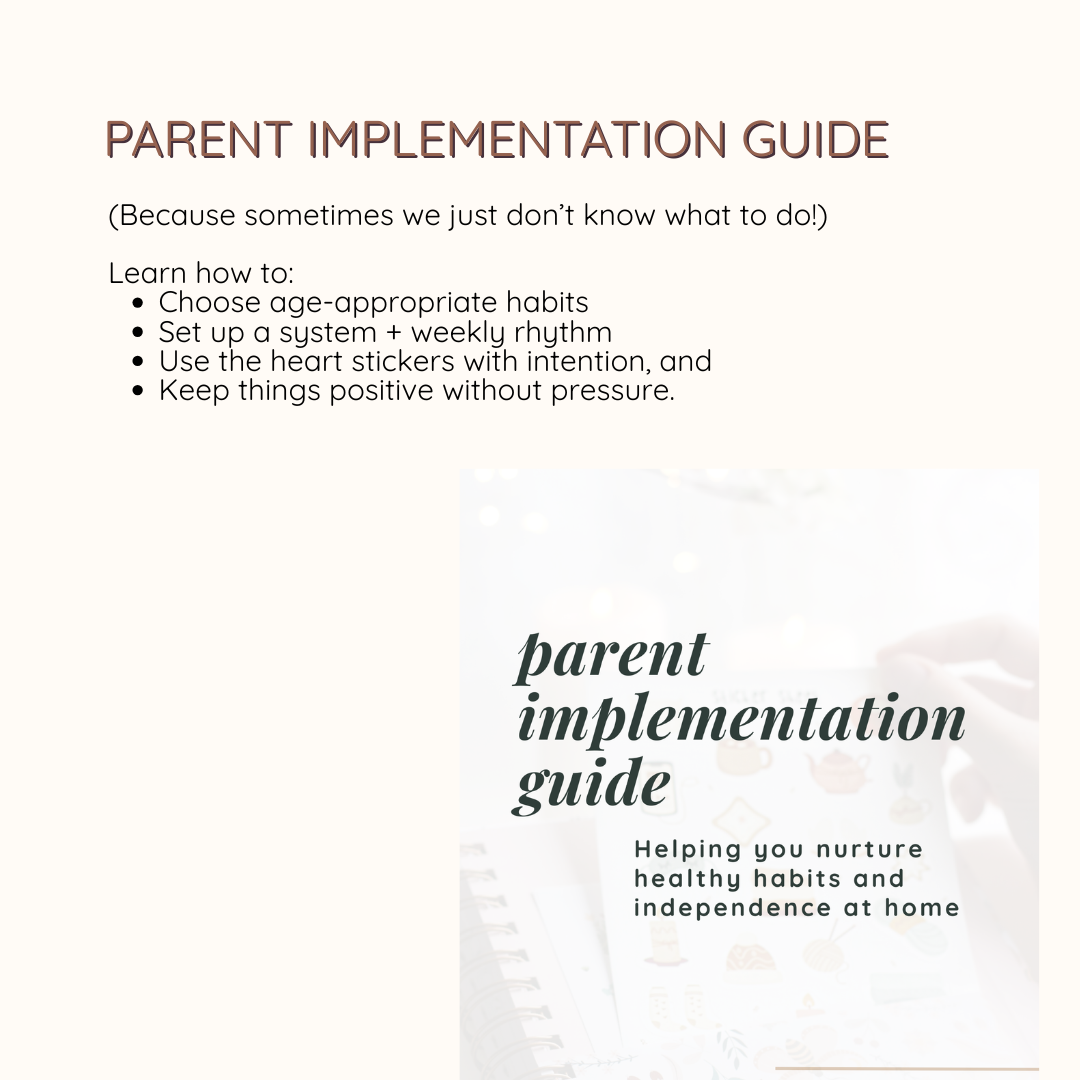 3. Parent Implementation Guide: Created by child development specialist and interior designer Penny Miller, this short, practical guide helps parents apply the story’s ideas in everyday life.   Delivered straight to your inbox, it offers clear, parent-friendly advice on choosing age-appropriate habits, setting up a weekly rhythm, and keeping motivation strong without pressure or overwhelm. It also includes practical scripts, reflection prompts, and guidance for talking about “the home’s heart,” helping families reconnect with the book’s message even when routines wobble or motivation dips.
